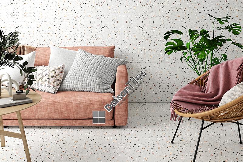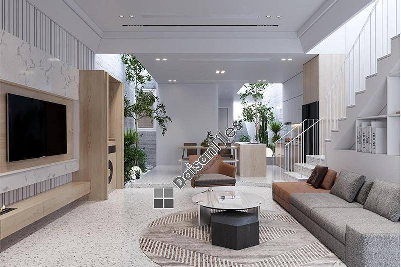 Gạch Terrazzo cũng là một trong những mẫu gạch khá được ưa chuộng trên thị trường hiện nay. Đặc điểm của dòng gạch này là có bề mặt chống trơn trượt hiệu quả, kết hợp với đó là họa tiết hạt đa sắc màu cùng những chi tiết nhũ, giúp tạo nên vẻ đẹp độc đáo, sáng tạo cho không gian phòng khách.